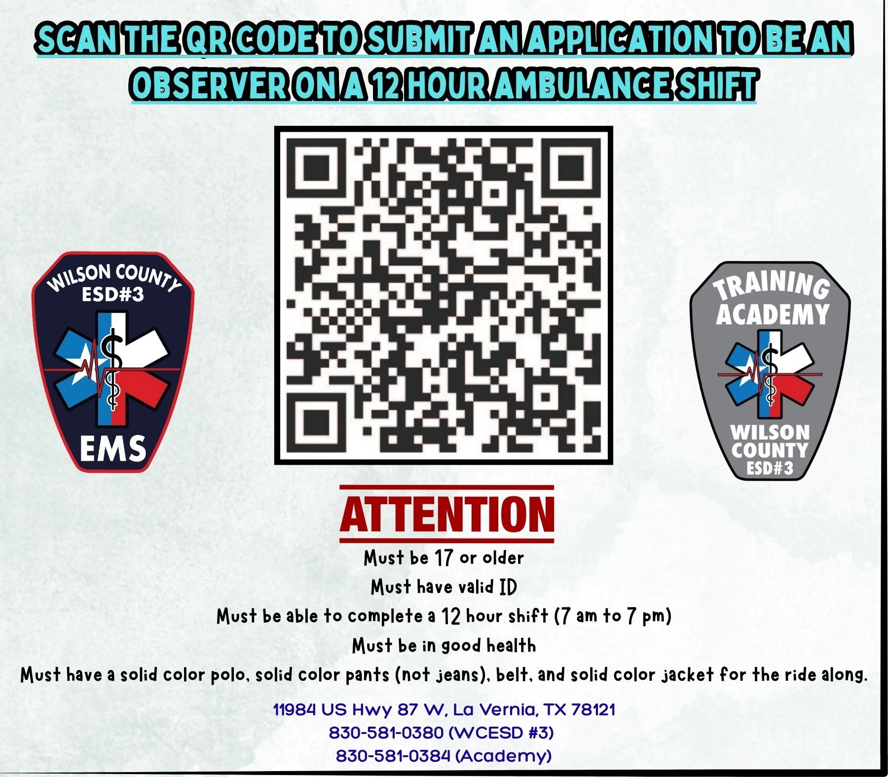 We encourage any that is interested in an EMS career to do a 12-hour ride out on an ambulance with WCESD #3. Must be 17 or older and in good health! If approved for a ride out, you will be contacted to schedule your date. Shift times are 7 am to 7 pm only.